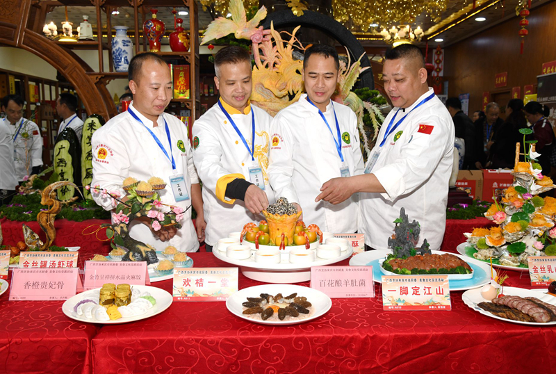 在美食文化展示区,龙凤吉祥的食材雕艺格外引人注目,各位大厨们都亮出自己拿手菜肴,有20余种特色菜肴闪亮登场,美食诱人,暇目不接,如:“双龙戏珠”菜肴,寓意祥瑞和吉祥。“欢桔一堂”菜肴,寓意大吉大利,对团聚的美好祝愿和新一年的美好期待。每一道菜肴制作的背后,有一个传奇动人好故事,也是一个餐饮文化的缩影。让参与者分享和领略桂中美食文化丰富内涵。同时,也相互学习交流许多烹饪技巧,为餐饮事业发展景上添花。