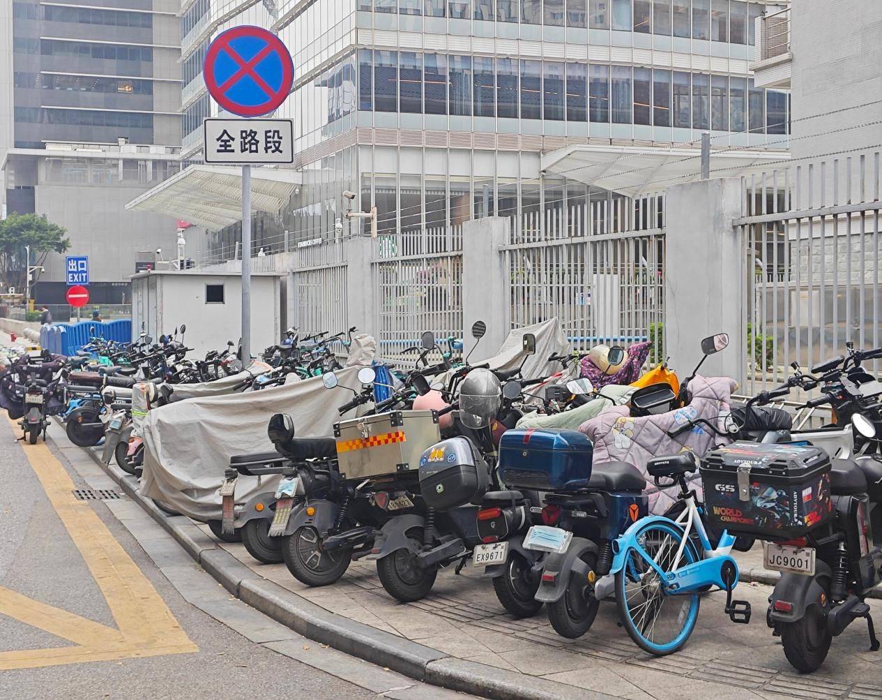 记者注意到,国金天地购物中心安排了三个工作人员在现场负责维护电动自行车的停放秩序。“有些电动自行车会乱停放,阻碍行人走路,也让来我们商场消费的顾客出入非常不方便,我们只能每天都安排专人管理这些电动自行车,尽量保证人行道有路可走。”一位国金天地购物中心的工作人员表示。