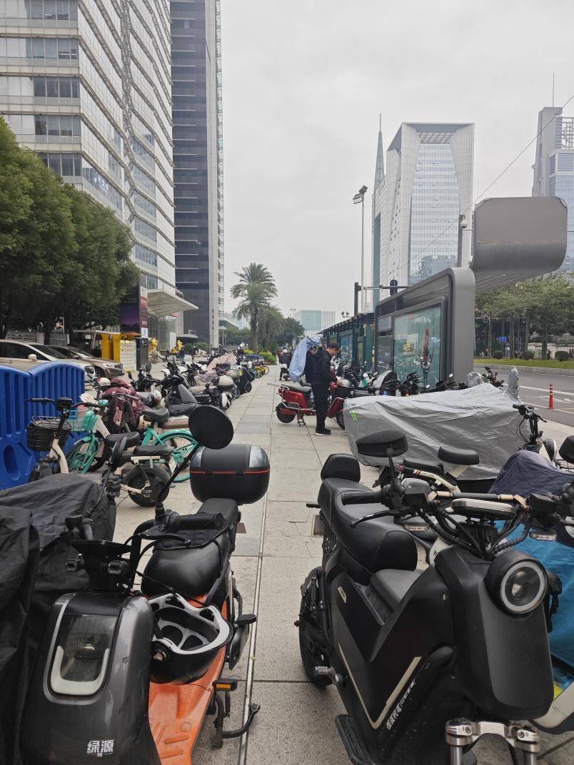 在国金天地购物中心北门的人行道上,超过一半的区域被停放的电动自行车占据,只有一条狭窄的道路供行人通行。