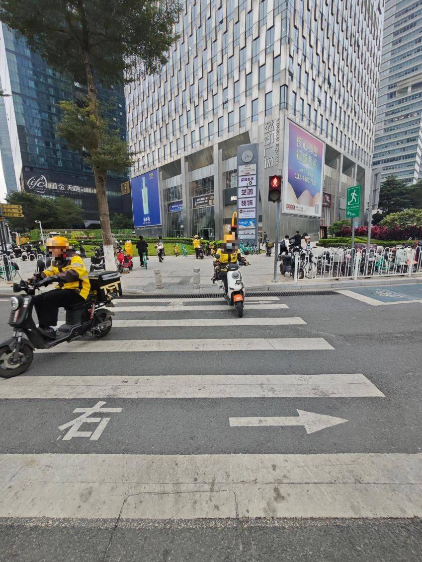 除了乱停放,电动自行车的交通违法行为也同样突出。记者在花城大道与华夏路交界的一个路口等红绿灯过马路时,发现有多辆电动自行车闯红灯通过,且在斑马线上没有下车推行,其中不少是外卖骑手。