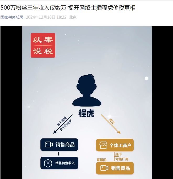 据国家税务总局官方微信号,据悉,程虎3年直播带货收入超千万(带货佣金收入352.89万元,个体工商户商品销售收入749.85万元),申报个税的收入竟未达5000元起征点,账目混乱,企图逃避缴税。厦门市税务局第一稽查局依据相关法律法规,对程虎追缴税费款、加收滞纳金并处罚款,共计199万元。