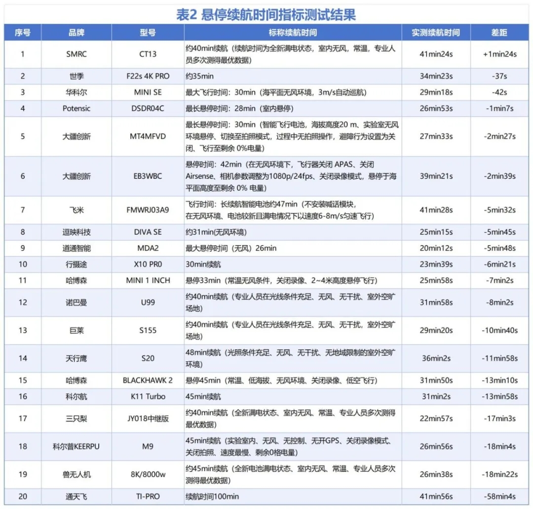 测试结果显示,有6款样品的实测续航时间与说明书或网页宣称的续航时间差距在3min以内,表现优秀;有6款样品续航时间差距在3min~10min之间,表现良好;有7款样品续航时间差距在10min~20min之间;有1款样品续航时间差距达58min4s。此外,有多款样品的续航时间测试条件描述不够详细,如未明确是否安装/开启避障模块、补光灯、录像模式等,用户难以获得有效的参考信息。详见表2。