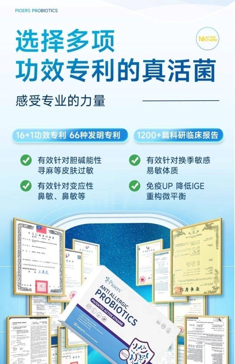 在Pioers舒敏益生菌详情页面可以看到,该款产品含16种专利功效活菌,包含过敏/免疫/炎症/肠道等经过临床及专利认证的菌株,如副干酪乳杆菌、罗伊氏乳杆菌、干酪乳杆菌、鼠李糖乳杆菌、乳酸乳球菌、乳双歧杆菌等。此外,宣传页面还声称该产品复配益生元,菌群在人体内存活率达95%,是一款针对易敏体质、皮肤敏感、荨麻疹、鼻眼过敏等多种过敏情况的益生菌产品。