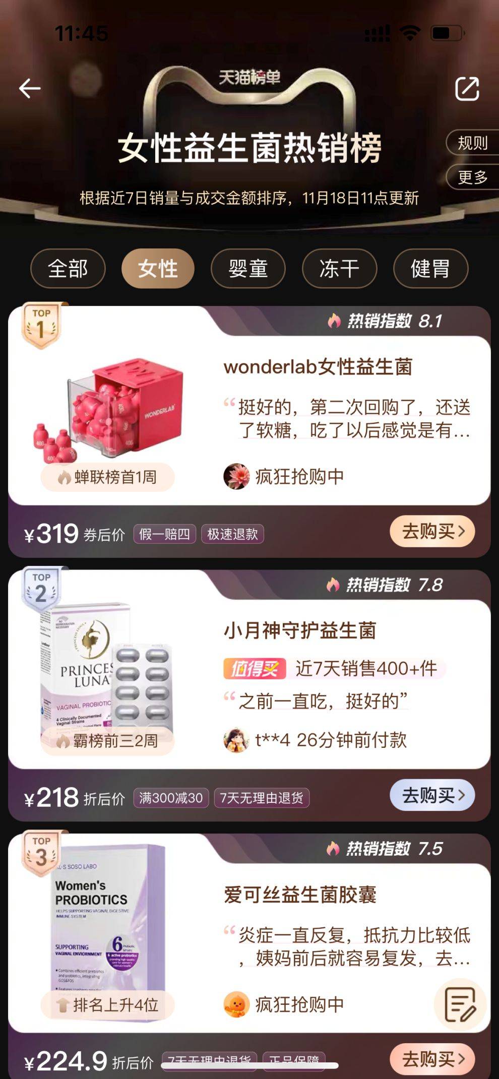 其中,肠道益生菌销量最高,达30万件以上,体重管理的益生菌以及女性益生菌的销量紧追其后,均在10万件以上。据天猫《女性益生菌热销榜》,万益蓝蔓越莓益生菌位居榜首,近7天销售1000+件。