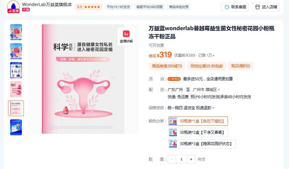 点进产品页面可以看到,万益蓝蔓越莓益生菌单价为319元,销量超1万件,采用的菌株包括鼠李糖乳杆菌、罗伊氏乳杆菌、植物乳杆菌、乳双歧杆菌、嗜酸乳杆菌、副干酪乳杆菌6种。此外,还可以看到“温和呵护无依赖”“专为小姐姐养好菌”“科学搭配,源自健康女性菌株,迁徙定植秘密花园”等宣称语。