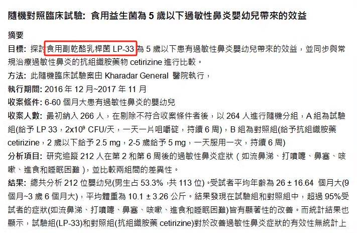 另一份人体研究报告则更荒诞,该报告中对比的是使用地奈德乳膏+盐酸西替利嗪、鼠李糖乳杆菌后的效果,以证明采用鼠李糖乳杆菌对过敏性疾病的有效性,与商家页面所称的“经过多项人体临床验证”毫无联系。