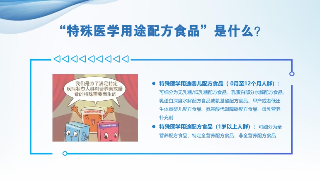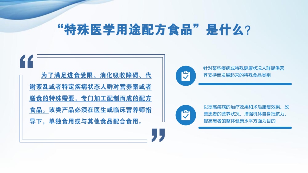 特殊医学用途配方食品是为满足进食受限、消化吸收障碍、代谢紊乱或者特定疾病状态人群对营养素或者膳食的特殊需要,专门加工配制而成的配方食品。属于特殊食品的范畴,包括适用于0—12月龄的特殊医学用途婴儿配方食品和适用于1岁以上人群的特殊医学用途配方食品。 2 日常生活中该如何辨别、选购“特医食品”?