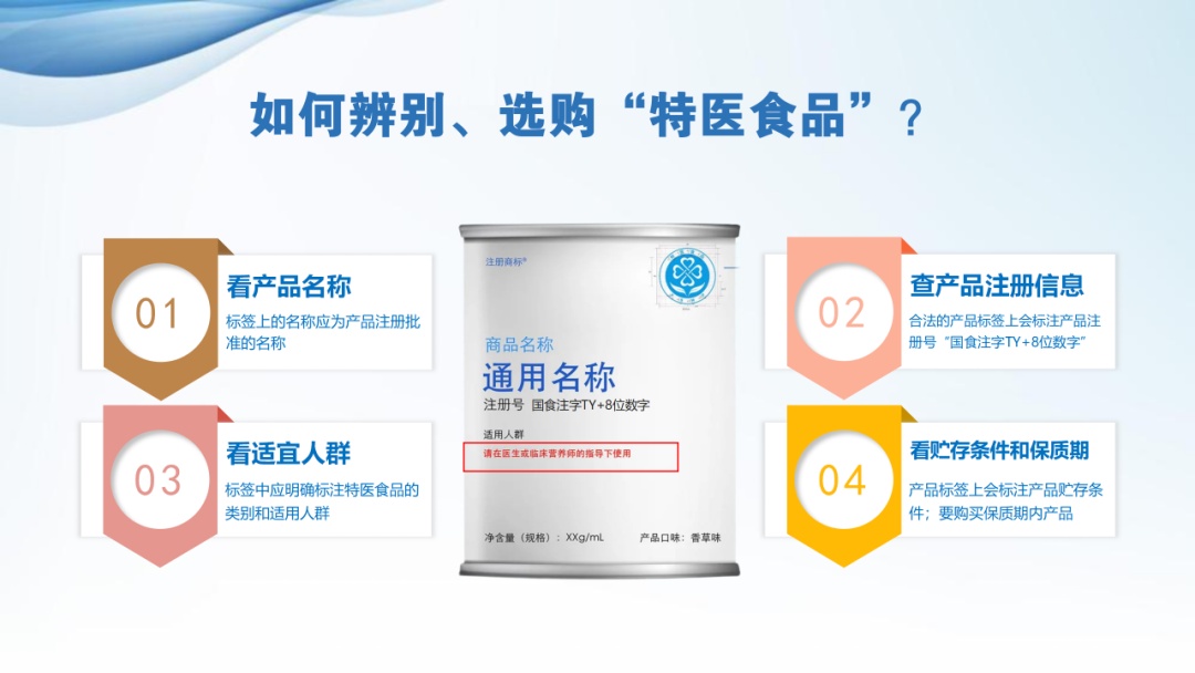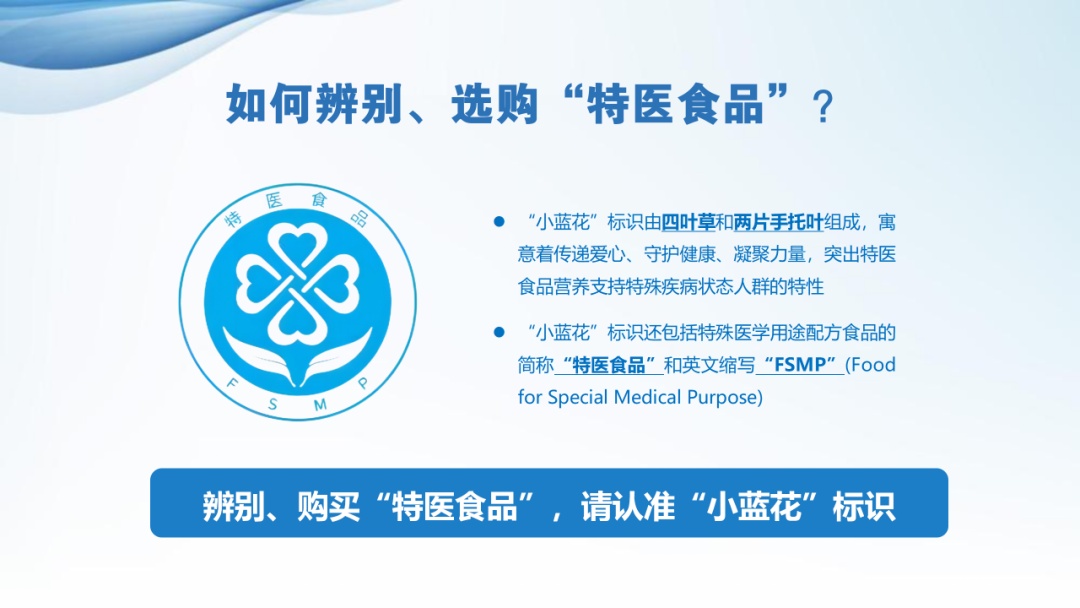 辨别、选购特殊医学用途配方食品时,要认准“小蓝花”标识,它由四叶草和两片手托叶组成,还包括特殊医学用途配方食品的简称“特医食品”和英文缩写“fsmp”(food for special medical purpose)。同时,也要注意看产品名称、产品注册信息、适宜人群、贮存条件和保质期等。 特殊医学用途配方食品消费提示 消费者需要在医生或临床营养师指导下食用特殊医学用途配方食品,同时要着重注意以下4个方面: 1、看产品名称:产品标签上的产品名称应为产品注册批准的名称。 2、查产品注册信息:合法的产品标签上会标注产品注册号“国食注字ty+8位数字”。已获批的注册产品信息可以到国家市场监督管理总局官方网站中的“特殊食品信息查询”模块中进行查询。 3、看适宜人群:合法产品标签中应明确标注特殊医学用途配方食品的类别和适用人群。 4、看贮存条件和保质期:产品标签上会标注产品贮存条件、保质期等信息,要购买保质期内产品,并按贮存条件保存产品。 3 “特医食品”和“保健食品”的区别
