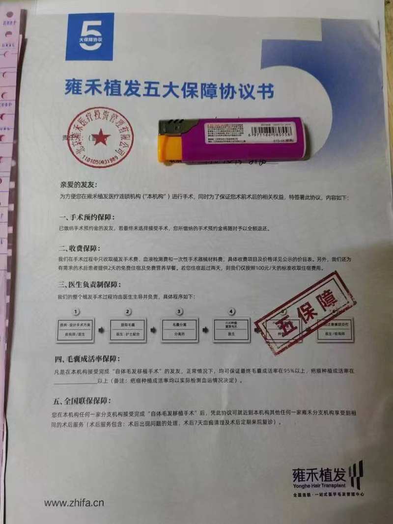 雍禾植发给消费者出示的五大保障协议书。受访者供图