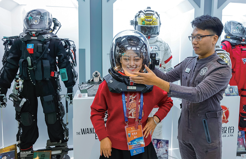 2023年10月18日,在2023成都世界科幻大会主题展览上,科幻迷试戴根据《流浪地球》1比1制作的可穿戴装备 沈伯韩摄