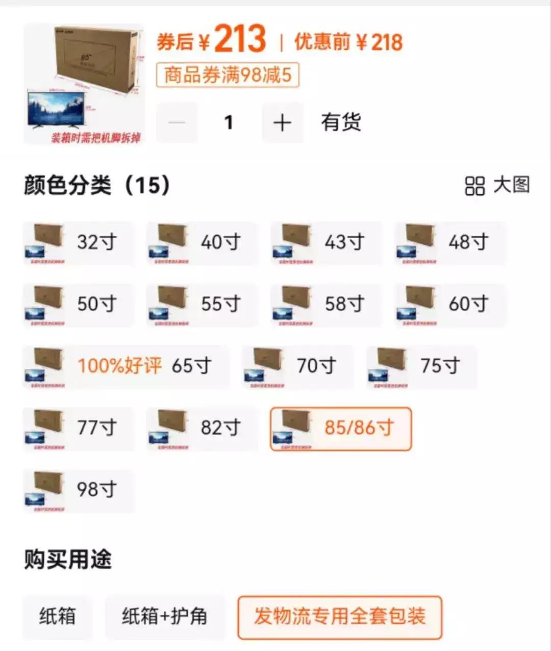以70寸的发物流全套液晶电视包装盒为例,网上售价在120元左右,某商户的85寸的发物流全套专用包装盒售价为213元。
