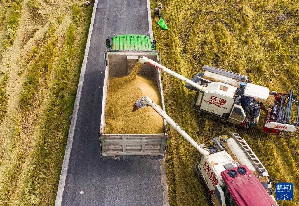 10月25日,收割机把收割的稻谷装车(无人机照片)。