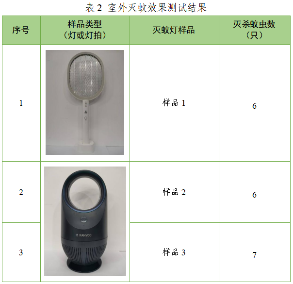 另外,试验人员又更换了试验环境,对其中3款样品进行了灭蚊效果的探究:下午17时,将3款灭蚊灯同时置于室外空旷且蚊虫较多的场所(无人员走动、无外源性光源干扰),光源离地23厘米,并且为减小光源之间的影响,灭蚊灯之间均间距4.5米,接通电源,次日上午10时关闭电源并检查死亡蚊虫数。结果显示,3款灭蚊灯样品确实具有灭蚊效果,但并未达到通过光源吸引周边蚊虫而大量灭杀的效果,详见表2。