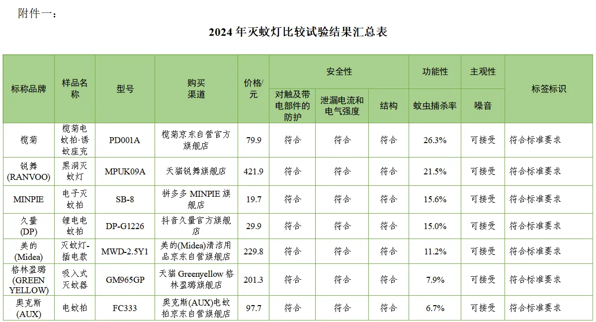 总体来看,本次比较的15款灭蚊灯样品实际灭蚊效果均不显著。