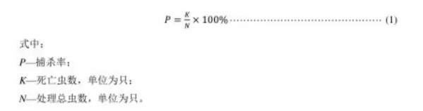 为模拟测试消费者在实际生活环境下灭蚊灯的真实灭蚊效果,本次灭蚊试验参考团体标准T/CSA073-2021《室内紫外LED诱蚊灯性能要求》中的测试方法,但对测试场景有所改变,具体情况如下:在容积33立方米(长宽高3.7米×3.3米×2.7米)的房间(配有床、床头柜、衣柜、空调、窗户及窗帘)中,将灭蚊灯样品置于测试房中央、光源离地1.5米处,关闭门窗及窗帘,将100只左右的蚊虫放入房间内,1小时后接通被测装置电源,接通电源24小时后关闭电源,检查死亡的蚊虫数,试验进行一次,每场测试均设空白对照组。试验结束后,计算各灭蚊灯样品的蚊虫捕杀率,其计算公式如下: