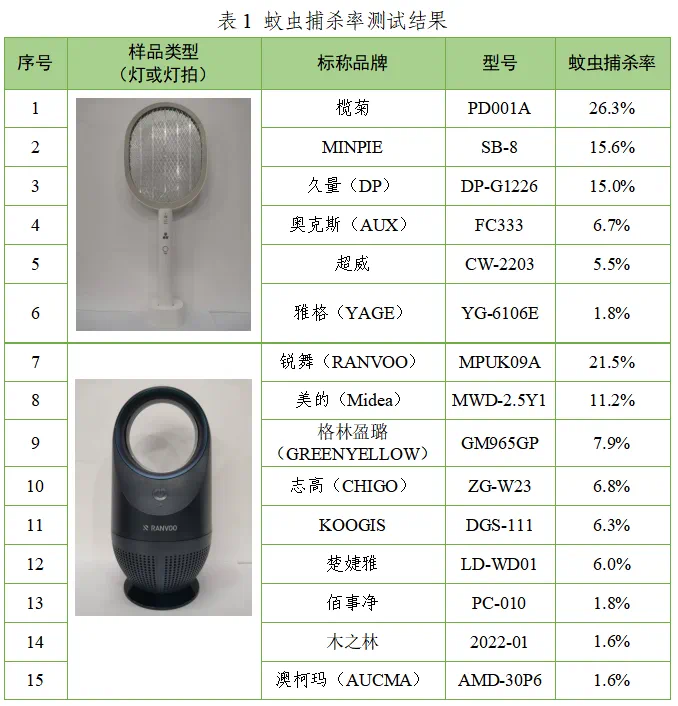 目前,市面上销售的灭蚊灯品类和功能繁多,但消费者其实际灭蚊效果却贬褒不一。为此,福建省消委会委托实验室参考相关标准,对15款灭蚊灯样品进行了灭蚊效果(蚊虫捕杀率)的研究性测试,结果仅供消费者参考。