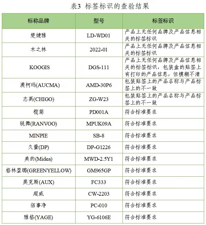 此次选购的15款样品中,有3款样品的包装或灯身上并无品牌及产品相关信息的标签标识,产品信息缺失;2款样品包装贴签上的产品名称与其产品标签上的名称不一致;其余10款样品包装及样品上的标签标识信息完整,均符合国家标准(GB4706.1-2005《家用和类似用途电器的安全第1部分:通用要求》)的相关要求,详见表3。