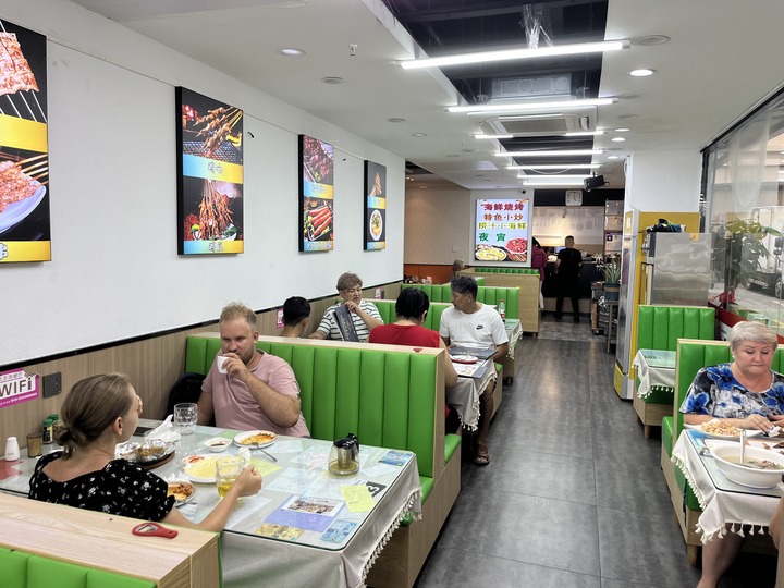 7月16日,外国游客在三亚的一家中餐馆用餐。(新华社记者 程潇 摄)