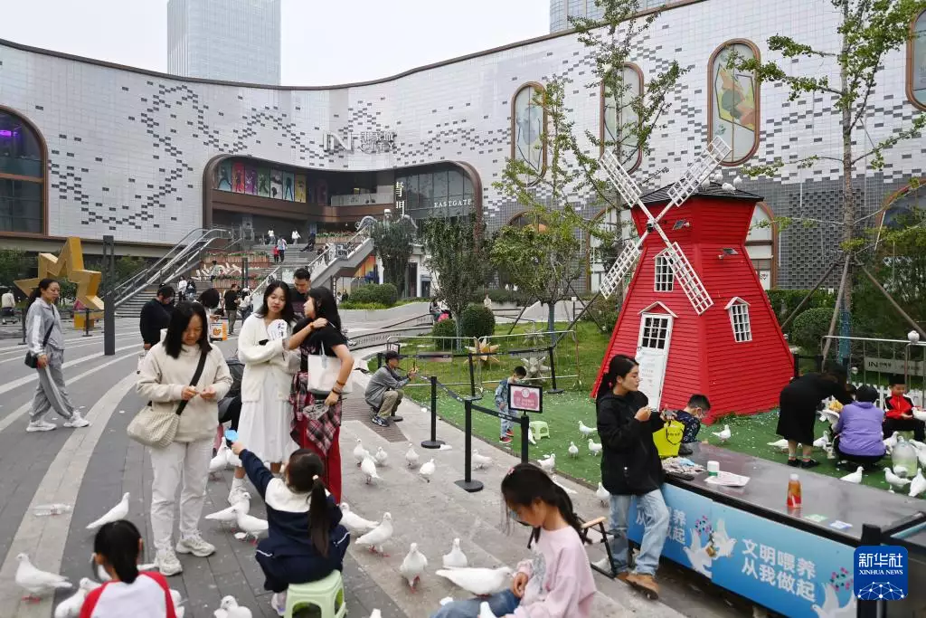 游人在天津金街的广场上喂鸽子(10月13日摄)。新华社记者 李然 摄