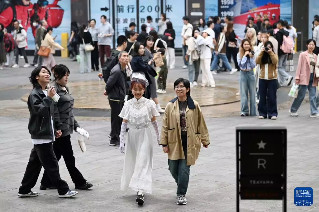 10月16日,市民、游客在金街观看演出。新华社记者 赵子硕 摄