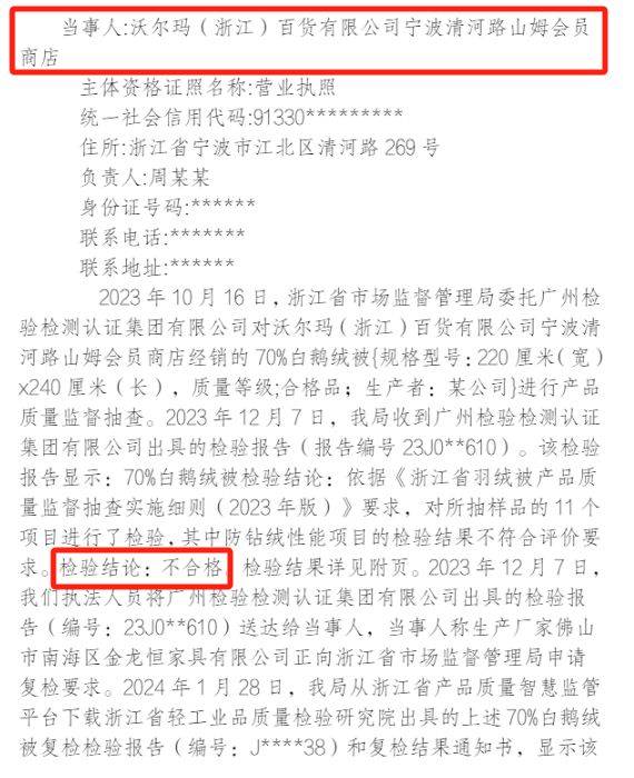 据国家市场监督管理总局官网发布的公告,今年5月,沃尔玛(浙江)百货有限公司宁波清河路山姆会员商店因销售的白鹅绒被抽检不合格被宁波市江北区市监局作出行政处罚。