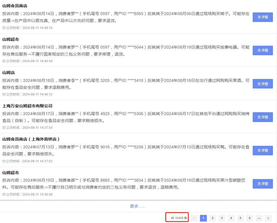 在全国12315消费投诉信息公示平台(以下简称“12315平台”)上,《消费者报道》记者输入“山姆”关键词可发现超一万条结果,仅9月11日当天,关于山姆的投诉便有近50条,其中大部分的问题均与食品安全有关。
