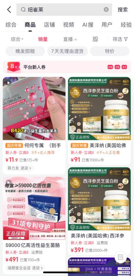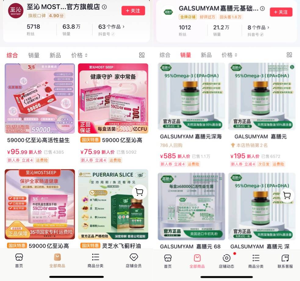 在直播平台,记者发现与“纽崔莱”相关、销量较高的产品还包括:由毫州市枫源堂生物科技有限公司生产的SEE YOUTH牌“灵芝水飞蓟籽油人参葛根片”,安徽晟泉药业有限公司生产的康善莱牌“氨糖软骨素”、山湖间牌“B420益生元益生菌冻干粉”、健而慧牌“牛初乳益生菌冻干粉(无蔗糖型)”、川小年牌益生元益生菌冻干粉以及酸枣仁益生菌冻干粉,安徽凯洪药业有限公司生产的至沁牌“牛初乳益生菌冻干粉”等产品。