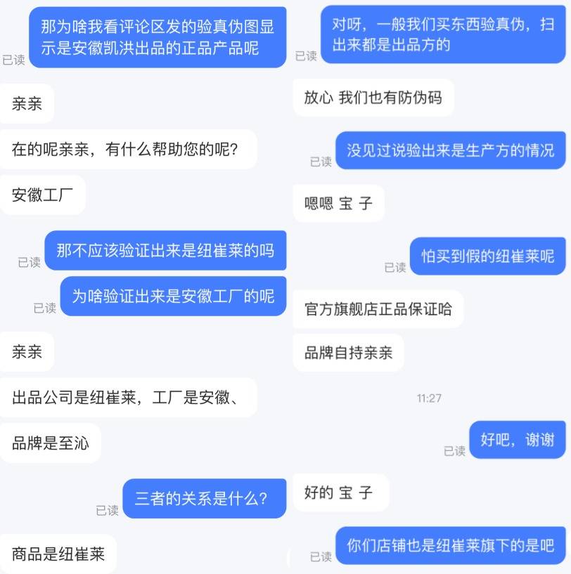 但记者在产品评论区看到,所谓的防伪码验证出来的是生产方安徽凯洪药业有限公司(以下简称“凯洪药业”),而非纽崔莱。对于这个疑问,该客服回复称,出品公司是纽崔莱,工厂是安徽,品牌是至沁,并表示商品是纽崔莱(的产品)。