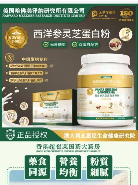 此外,在美泽纳MIZUNUN牌“西洋参灵芝蛋白粉”包装的正中央,可清晰看见“香港纽崔莱国药大药房”字眼,包装正面底部可以看到“美国哈佛美泽纳研究所”字样,但授权方却是澳大利亚悉尼生命健康研究院。