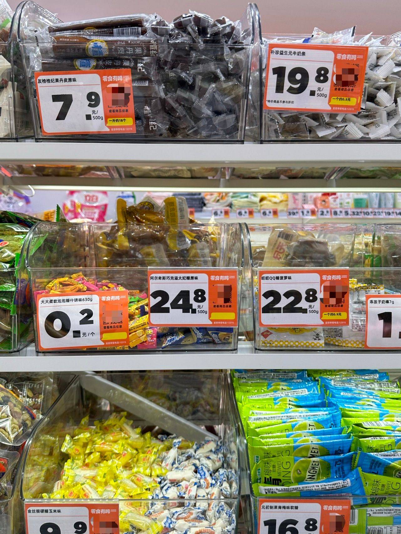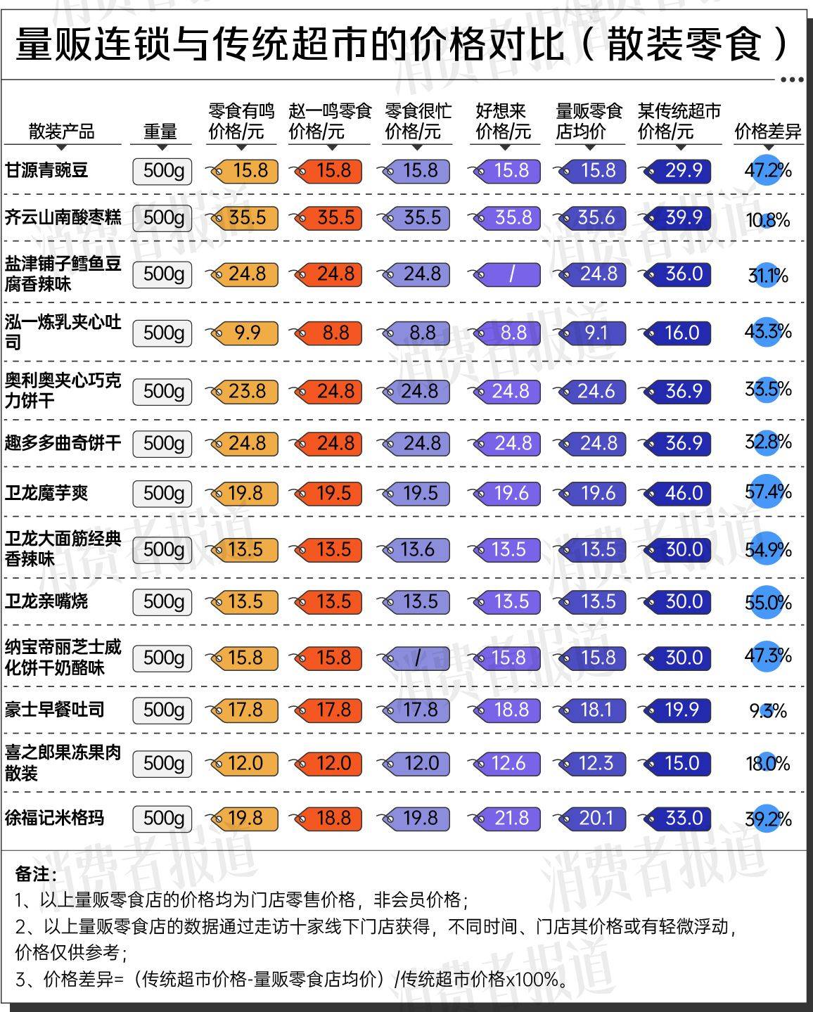 为了便于比较不同销售渠道的价格差异,并突显它们在特定商品上的性价比,记者将所有散装零食的价格同一换算为毎500克(即1斤)的单价进行对比。