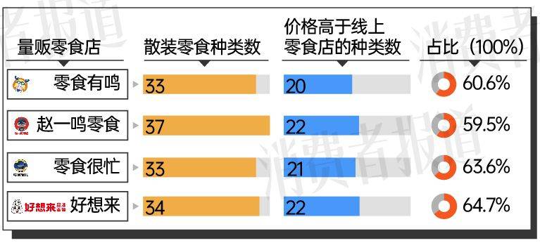 调查结果显示,量贩零食店有超过半数的散装零食价格高于线上。具体来说,在零食有鸣的33款散装零食中,有20款的价格超过了线上零食店,占比达到60.6%;赵一鸣零食的37款散装零食里,有22款价格高于线上,占比59.5%;零食很忙的33款散装零食中,有21款价格高于线上,占比63.6%;而好想来的34款散装零食中,有22款价格高于线上,占比更是达到了64.7%。
