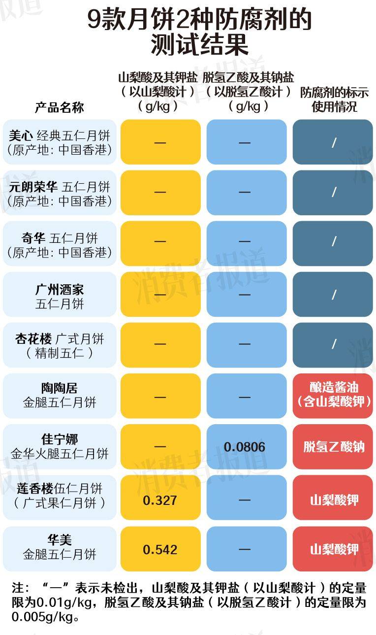5、防腐剂:莲香楼、华美检出山梨酸及其钾盐,佳宁娜检出脱氢乙酸及其钠盐。部分品牌(美心、元朗荣华、奇华、广州酒家、杏花楼)标示没有添加任何防腐剂。
