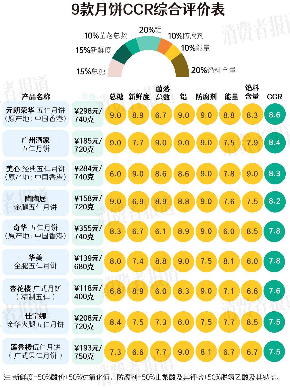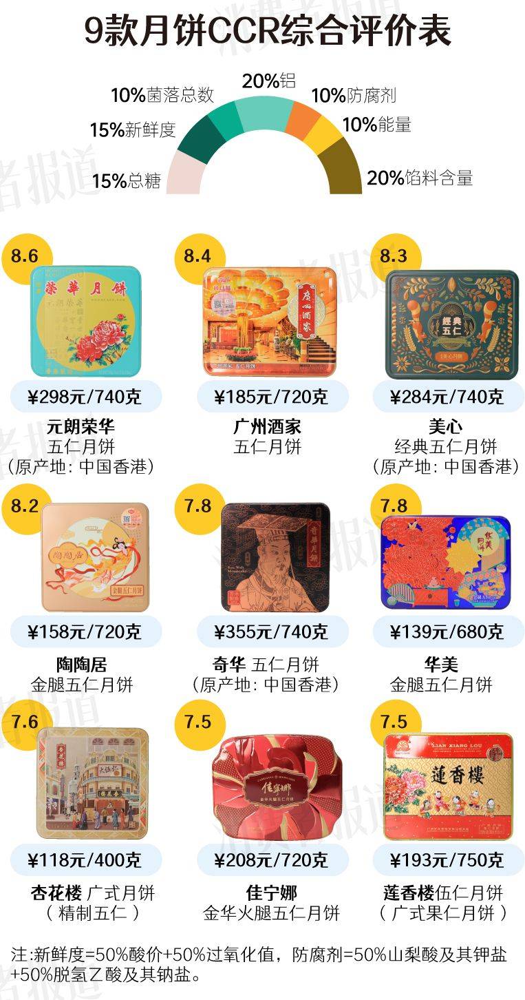 CCR综合评价结果显示,元朗荣华、广州酒家、美心排名靠前,CCR得分分别为8.6分、8.4分、8.3分,值得推荐。其中元朗荣华总糖含量较低,油脂新鲜度较优;广州酒家总糖含量最低,卫生状况最好;美心油脂新鲜度最优,馅料含量最高。3款均未检出常见的2种食品防腐剂。