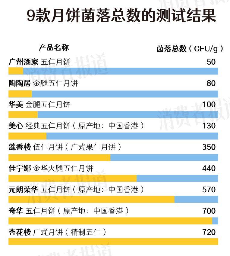 1、9款月饼均检出“细菌”,广州酒家清洁度最高,杏花楼略逊,两者菌落总数相差14.4倍。