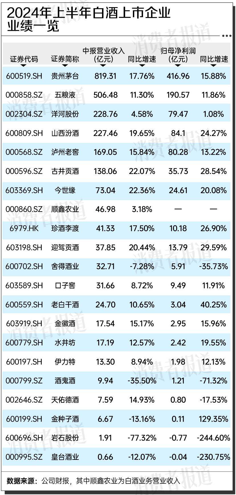 财报显示,贵州茅台(600519.SH)上半年实现营业收入819.31亿元,同比增长17.76%,实现归母净利润416.96亿元,同比增长15.88%。去年同期的营业收入和归母净利润同比增速为19.4%和20.8%。泸州老窖(000568.SZ)上半年实现营业收入169.05亿元,同比增长15.84%,实现归母净利润80.28亿元,同比增长13.22%。去年同期的营业收入和净利润同比增速分别为25.1%和28.2%。