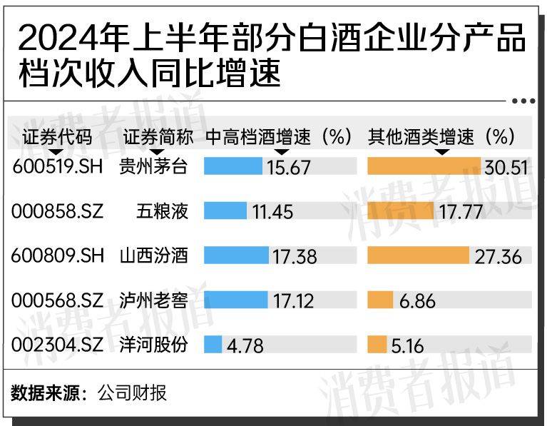 财报数据显示,贵州茅台今年上半年系列酒的同比增速比茅台酒同比增速高出14.84个百分点,五粮液在上半年高价位酒与中低价位酒的同比增速分别为11.45%和17.77%,中低价位酒增速明显高于高价位酒的同比增速。