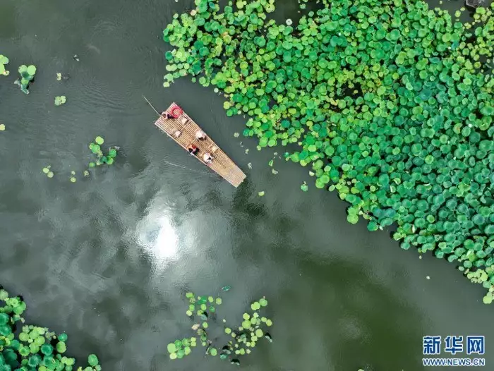 游客在安徽省黄山市徽州区呈坎古村乘竹筏游览(无人机照片)。