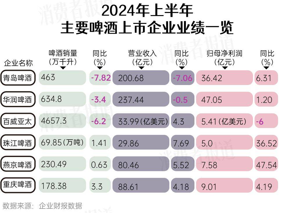 财报显示,2024年上半年,百威亚太实现营业收入33.99亿美元,同比增长4.3%,实现净利润5.41亿美元,同比下降6%;华润啤酒实现营业收入237.44亿元,同比下降6.31%;青岛啤酒实现营业收入200.7亿元,同比下降7.06%。