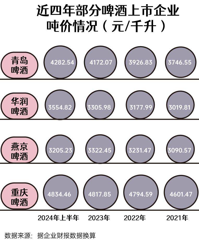 多家啤酒企业的吨价增速也比往年有所放缓。《消费者报道》记者梳理发现,今年上半年,包括青岛啤酒、重庆啤酒等在内的啤酒企业吨价增长幅度相比往年明显放缓。其中,重庆啤酒今年上半年吨价仅实现两位数的增长。