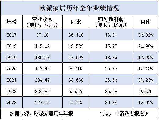 但大刀阔斧的转型阵痛一直萦绕整个2023年。从业绩上看,2023年欧派家居实现营收227.82亿元,同比微增1.35%,距2023年年初定下的“力争实现营业收入同比增10%-15%”目标有不小差距,并成为公司上市以来的最低年收入增速。今年上半年,欧派业绩更是进一步下探,营收、净利润双降,且降幅均在2位数以上。