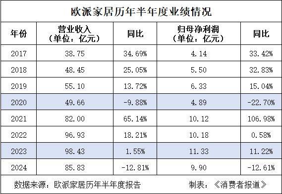 但转型让欧派家居业绩承压。据该公司最新发布的2024年半年度报告,今年上半年欧派家居营业收入为85.83 亿元,同比下滑12.81%;归母净利润9.90亿元,同比下滑12.61%,为欧派家居上市以来第二次在上半年出现营收、利润双降。