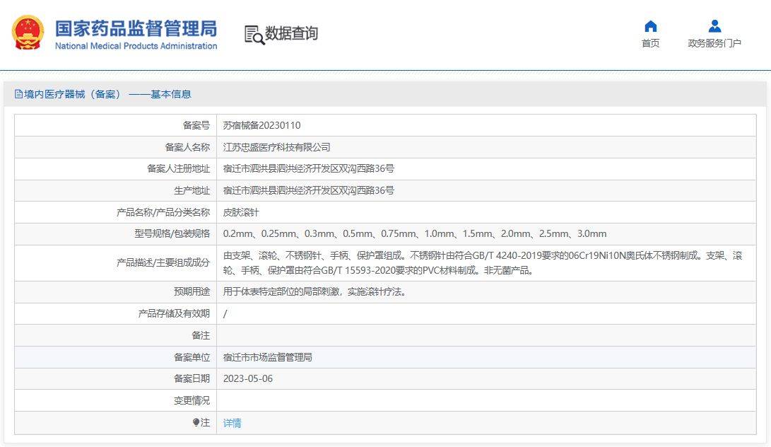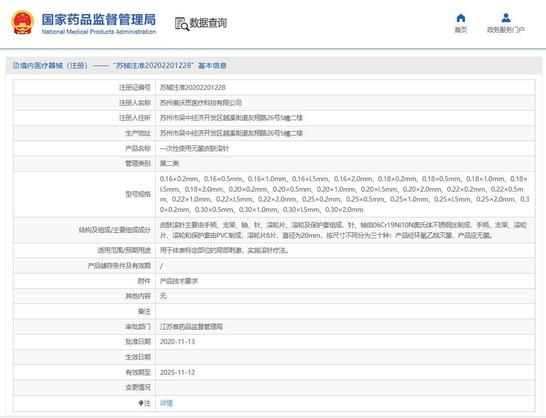 注册详情显示,这款皮肤滚针属于第二类医疗器械管理类别,且“经环氧乙烷灭菌,产品应无菌。”