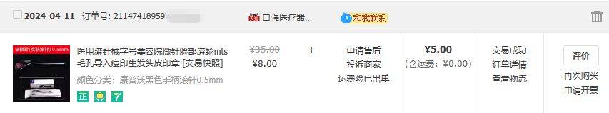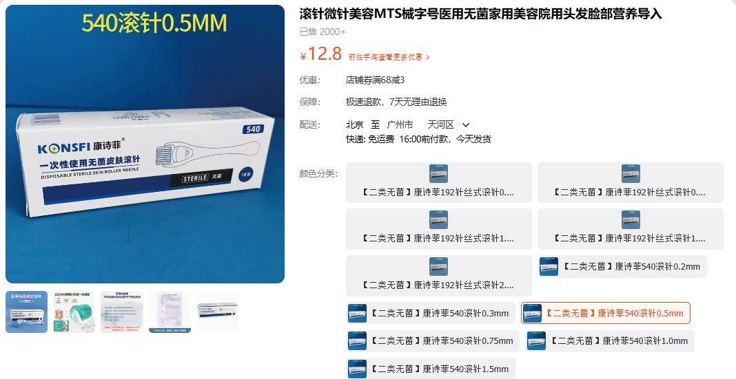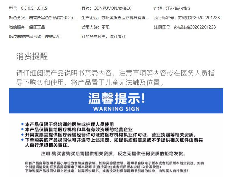 如下面这款“一次性使用无菌皮肤滚针”,就属于第二类医疗器械。根据店铺提供的产品信息,其注册证编号为苏械注准20202201228。