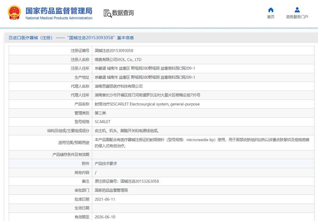 而市面上一些射频微针类产品,则属于第三类医疗器械,如注册证编号为“国械注进20153093058”的产品,相对管理更为严格。
