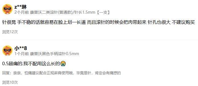 该店铺产品链接下方的用户评论显示,大多数购买者为普通消费者,有评论表示是通过博主“种草”的买来试试,也有用户在评论分享了自己在家使用滚针操作的步骤。此外,还有用户表示“手不稳的话容易在脸上划长一道,滚针的时候会把肉带起来”“0.5超痛的,我不配用这么长的”等类似评价。