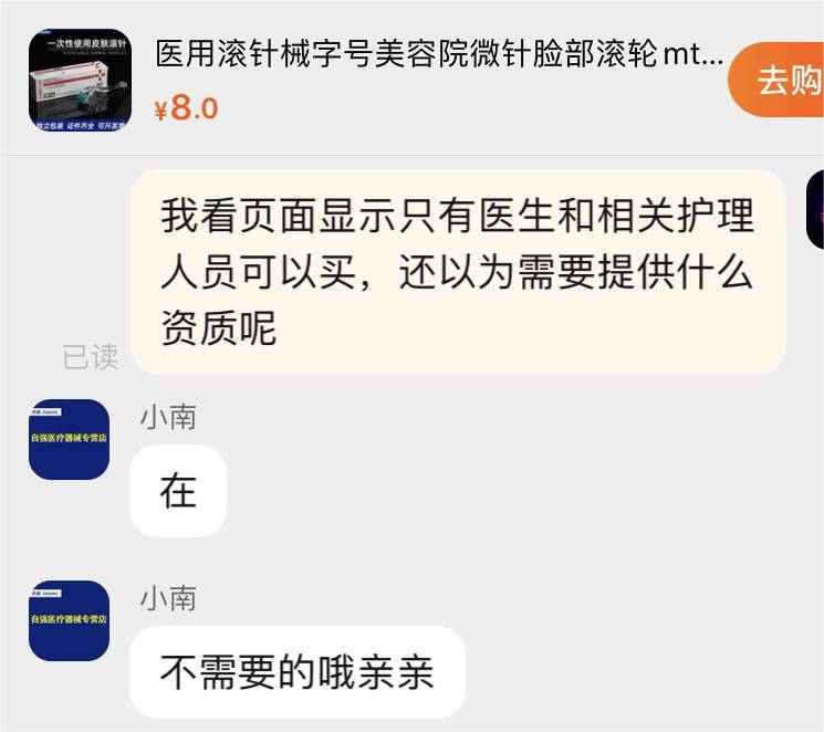 中国整形美容协会形塑与综合技术转化分会第一届理事会常务理事鲍峰在接受消费者报道记者采访时表示:“微针类医美项目需要由专业的医疗机构来施行。正规医院采购微针类产品需要走医疗器械采购渠道,而不具备医疗资质的机构(例如生活美容机构)不允许采购与使用微针。如果采购方是个人,则存在一定的灰色地带,因为仅对个人使用有规范,而对于个人采购没有相应的明文限制。”