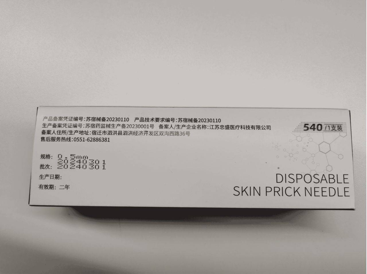 消费者报道也从电商平台上随机购买了一款皮肤滚针,产品包装标示的备案编号为苏宿械备20230110,属于第一类医疗器械。