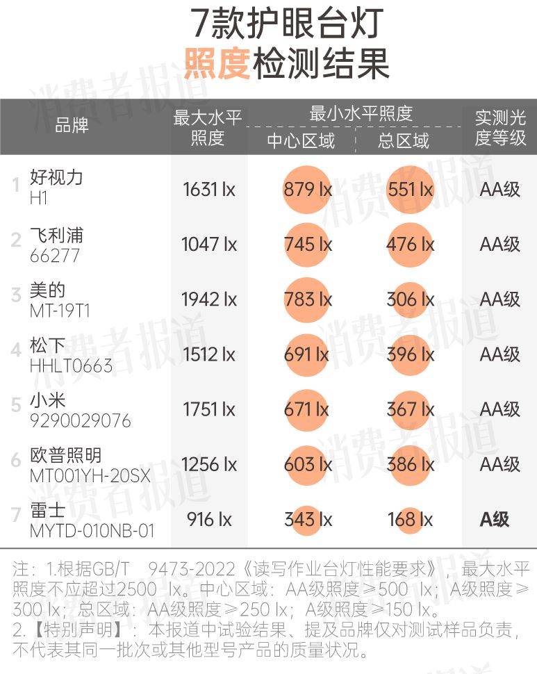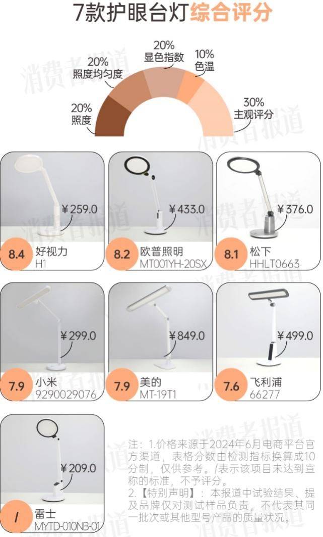 《消费者报道》综合照度、照度均匀度、显色指数、色温、主观评分等多项指标,得出7款护眼台灯的综合评分。