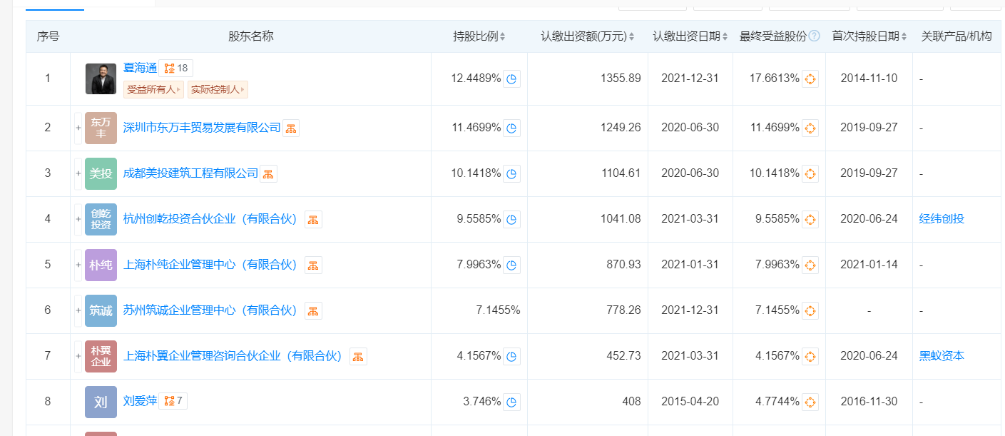 通过天眼查可以看到,朴诚乳业股东中,占比最高的企业是深圳市东万丰贸易发展有限公司,占比最高的个人除了董事长夏海通其次就是刘爱萍。