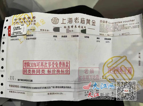 郭女士在老庙黄金红谷滩万达广场店购买金戒的凭证。